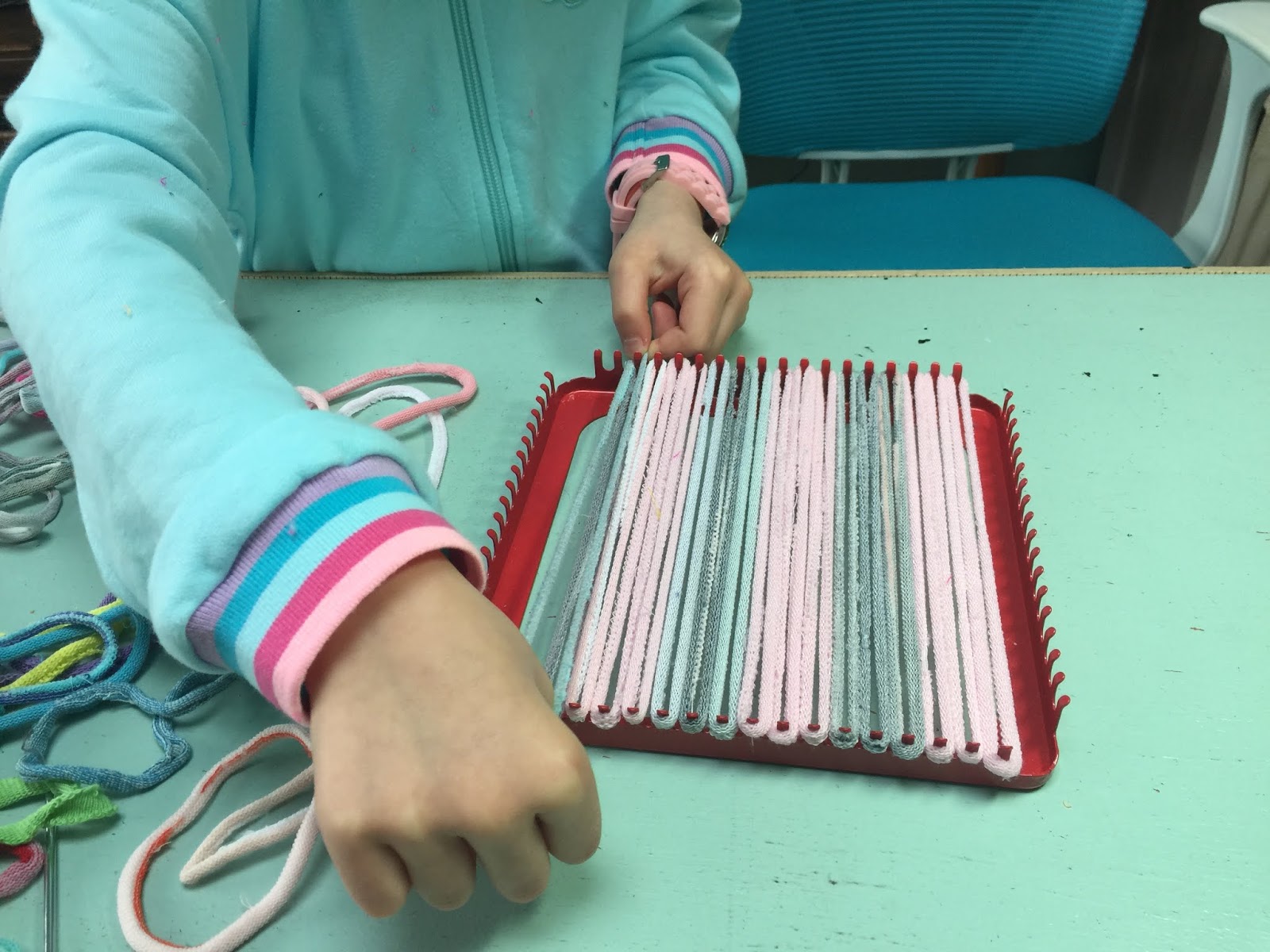 Do you remember weaving potholders as a kid? My sisters and I would weave them by the hour and then either give them as gifts or try to sell them to the neighbors for 25 cents each. Happy memories. Our granddaughter picked it up quickly and made lots of potholders to take home!